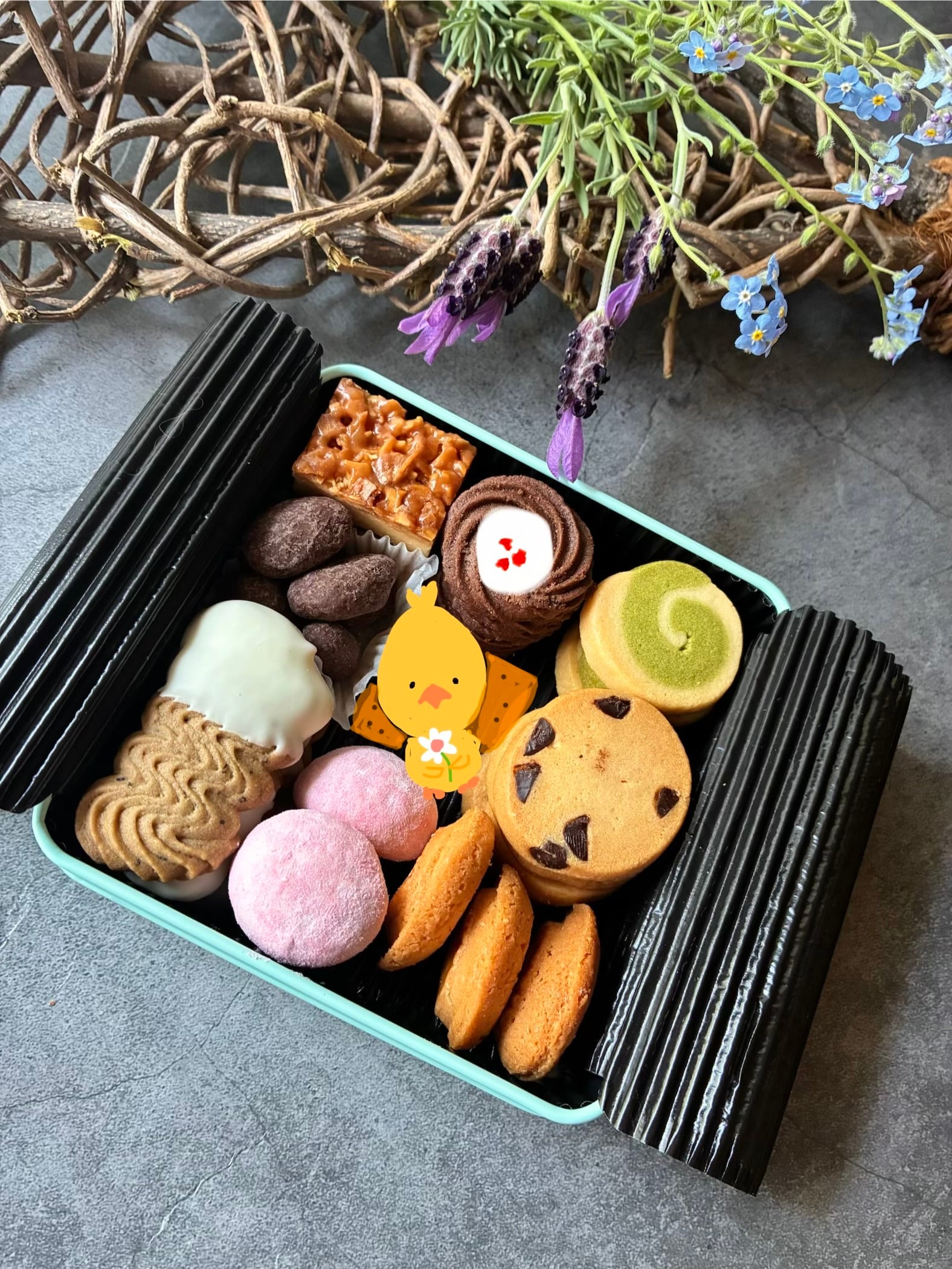 ひよこちゃんのアイシングクッキーと9種類のお菓子が入った可愛いブルーのクッキー缶になります。
