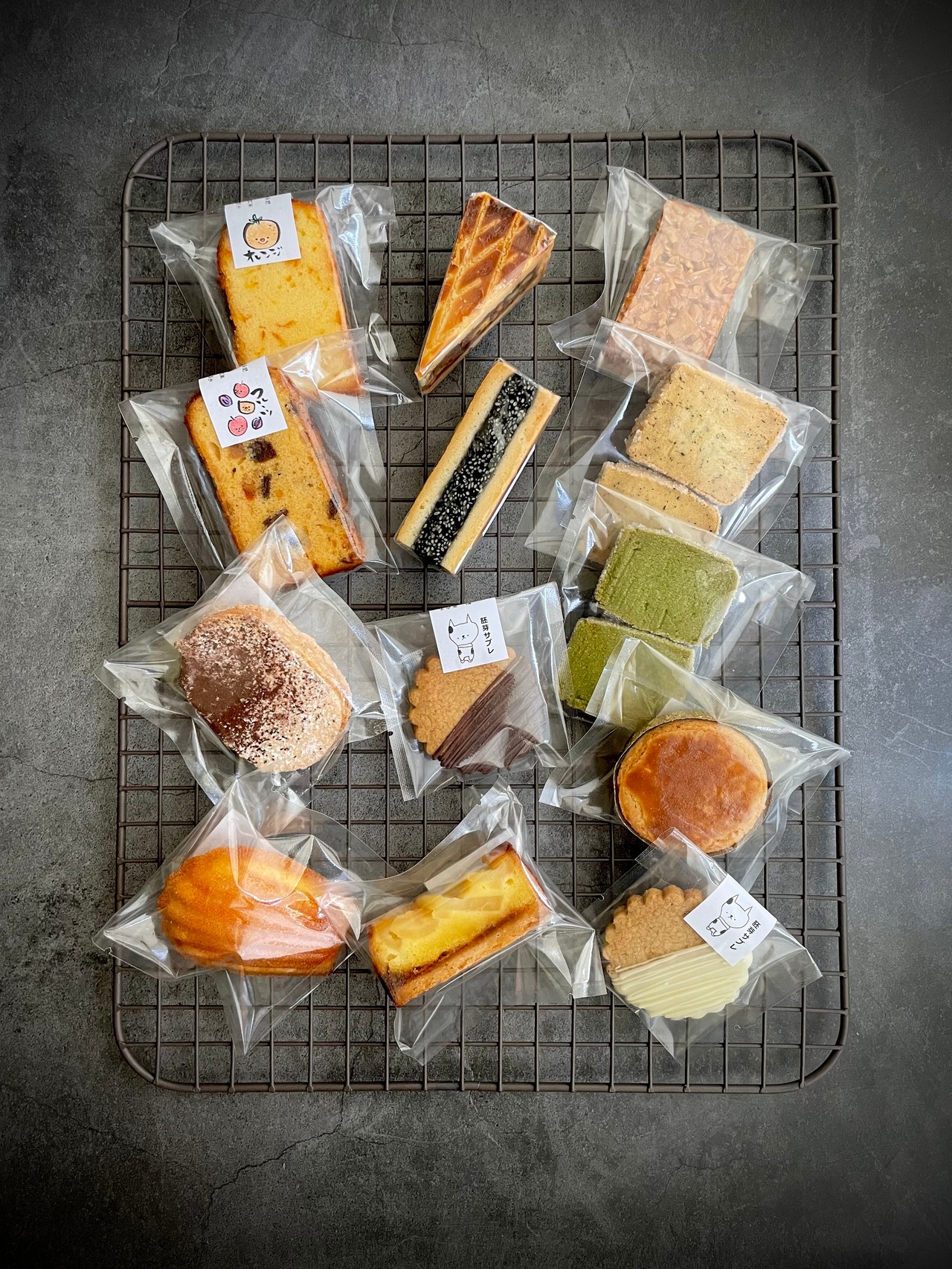 【主な原材料】北海道産小麦粉、砂糖、卵、バター、生クリーム、アーモンド、胡桃、オレンジスライス、フルーツミックス、蜂蜜、洋酒、黒豆、ヘーゼルナッツ、チョコレート、アールグレイ、胚芽、水飴、胡麻、ココア、抹茶、ココナッツ、ゲランドの塩、アルミフリーベーキングパウダーetc…